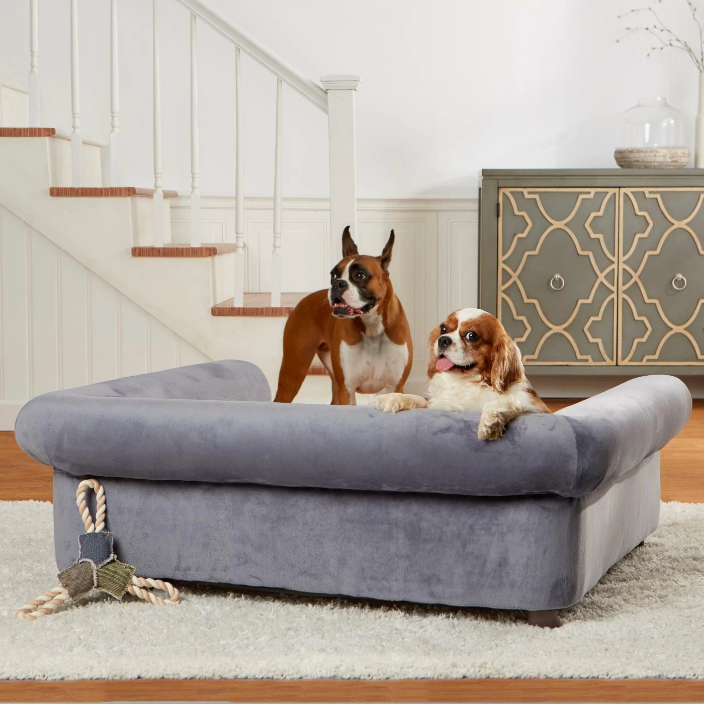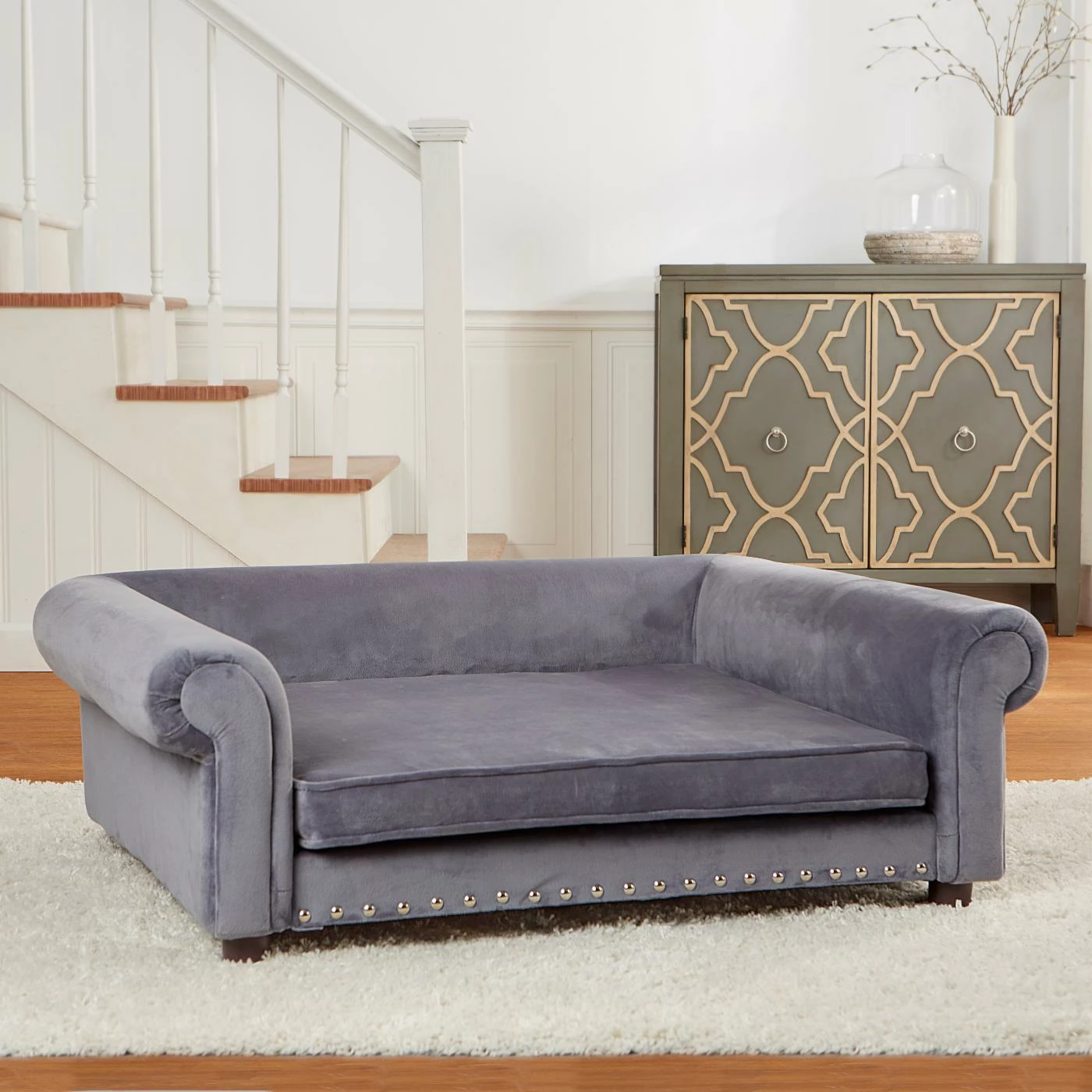 The Enchanted Home Pet Jackson Pet Sofa will give your pet the ideal place to relax. This gray, velvet upholstery will entice your pet to calmly relax. A sturdy wooden frame supports pets up to 100 pounds. Two-inch legs raise the sofa off the floor. The cushion cover is removable for easy machine washing. Help your pet enjoy luxurious comfort without sacrificing style with this charming pet sofa.