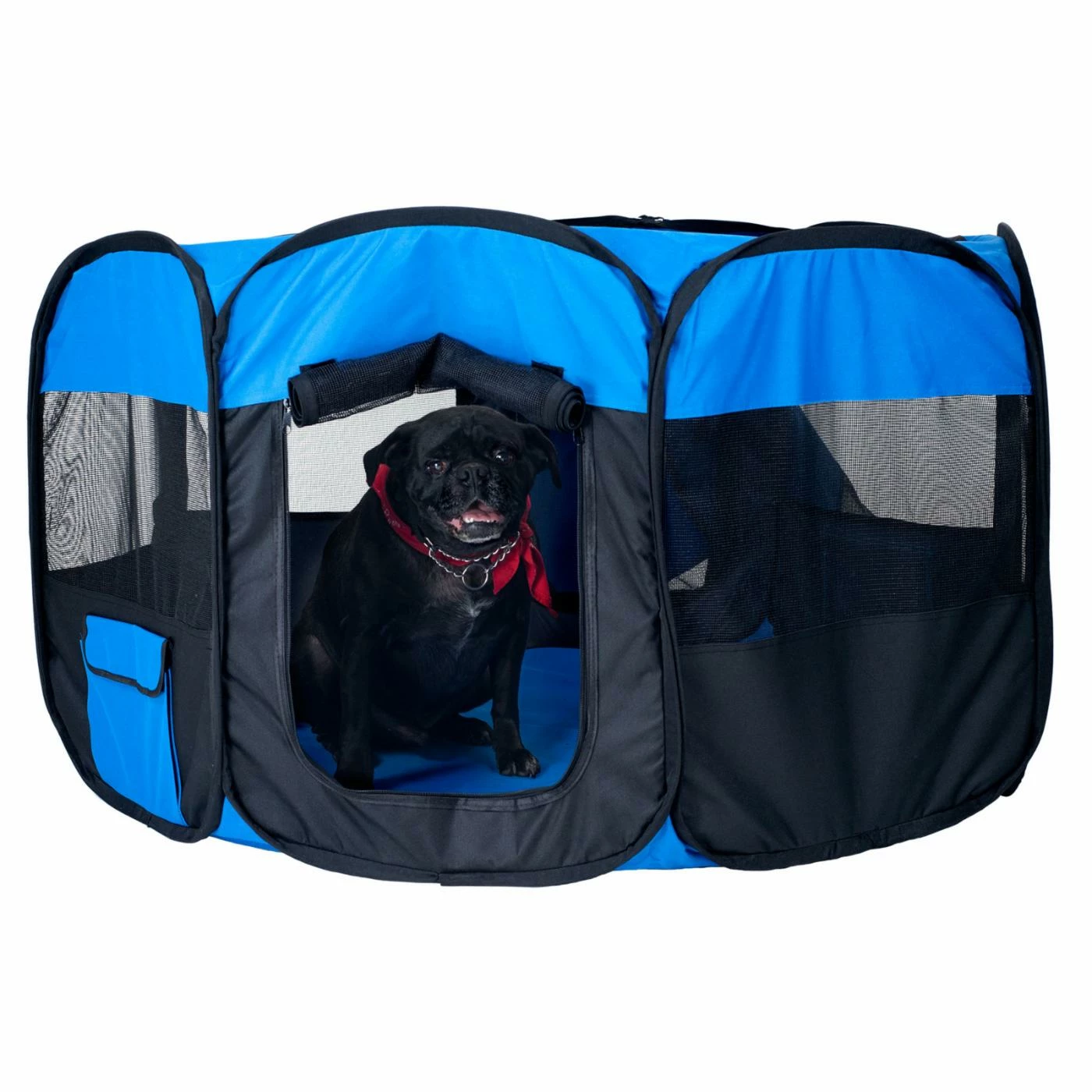Make sure your pet is comfortable and safe at home or on the go with the PAW Pet Pop-Up Playpen Deluxe with Canvas Carrying Bag. This sturdy canvas playpen is a great alternative to the traditional kennel. It pops up for easy installation and easily folds flat to fit in the included canvas carrying bag. Outside pocket provide room for treats, toys, and more. Two zip-up doors, a zippered mesh cover, and removable, washable floor make it perfect.