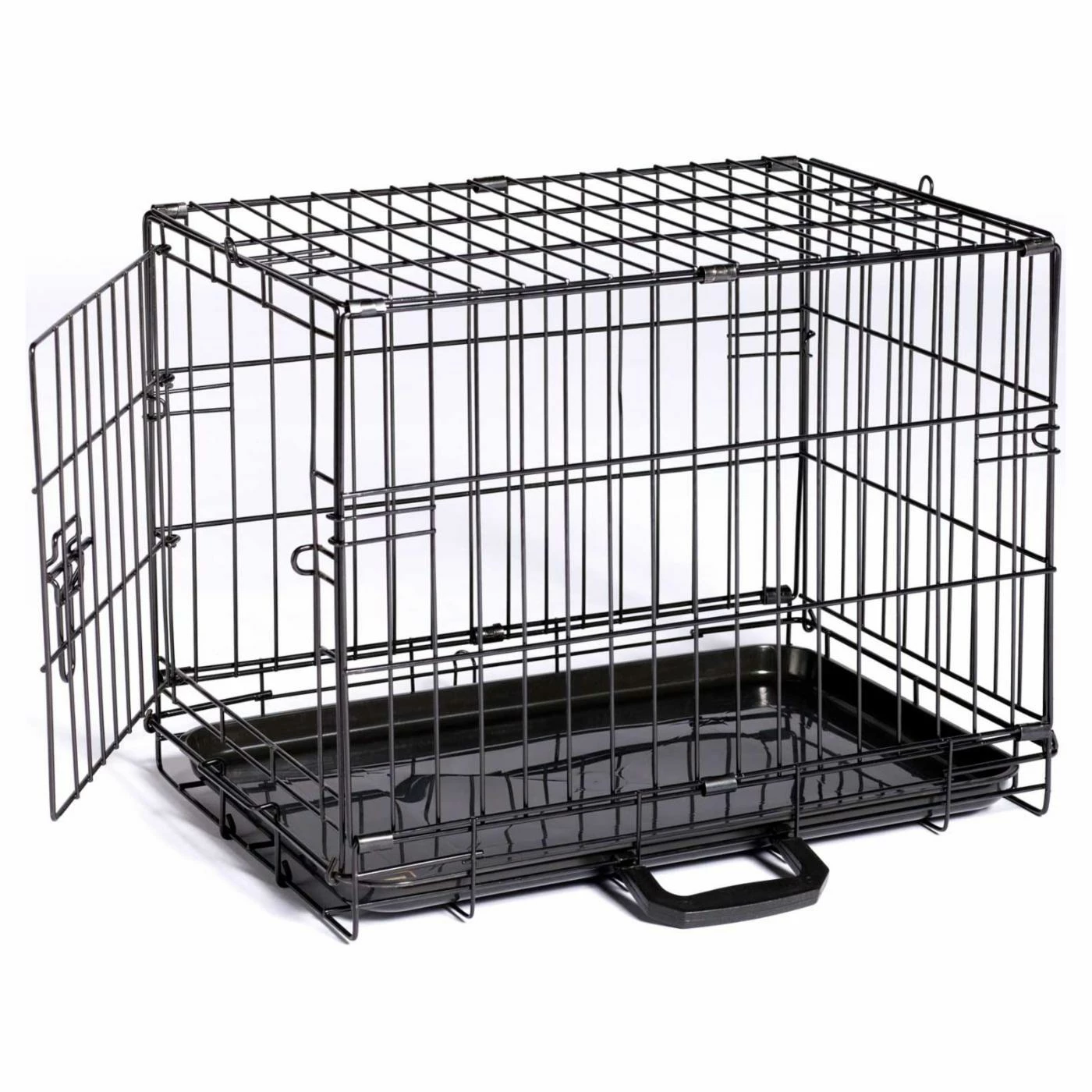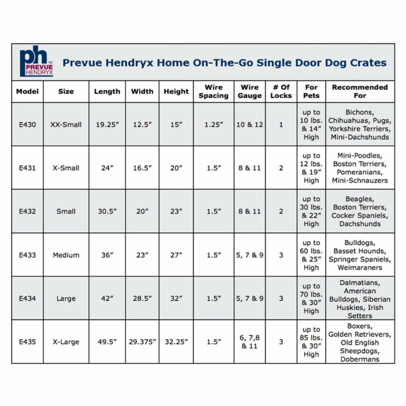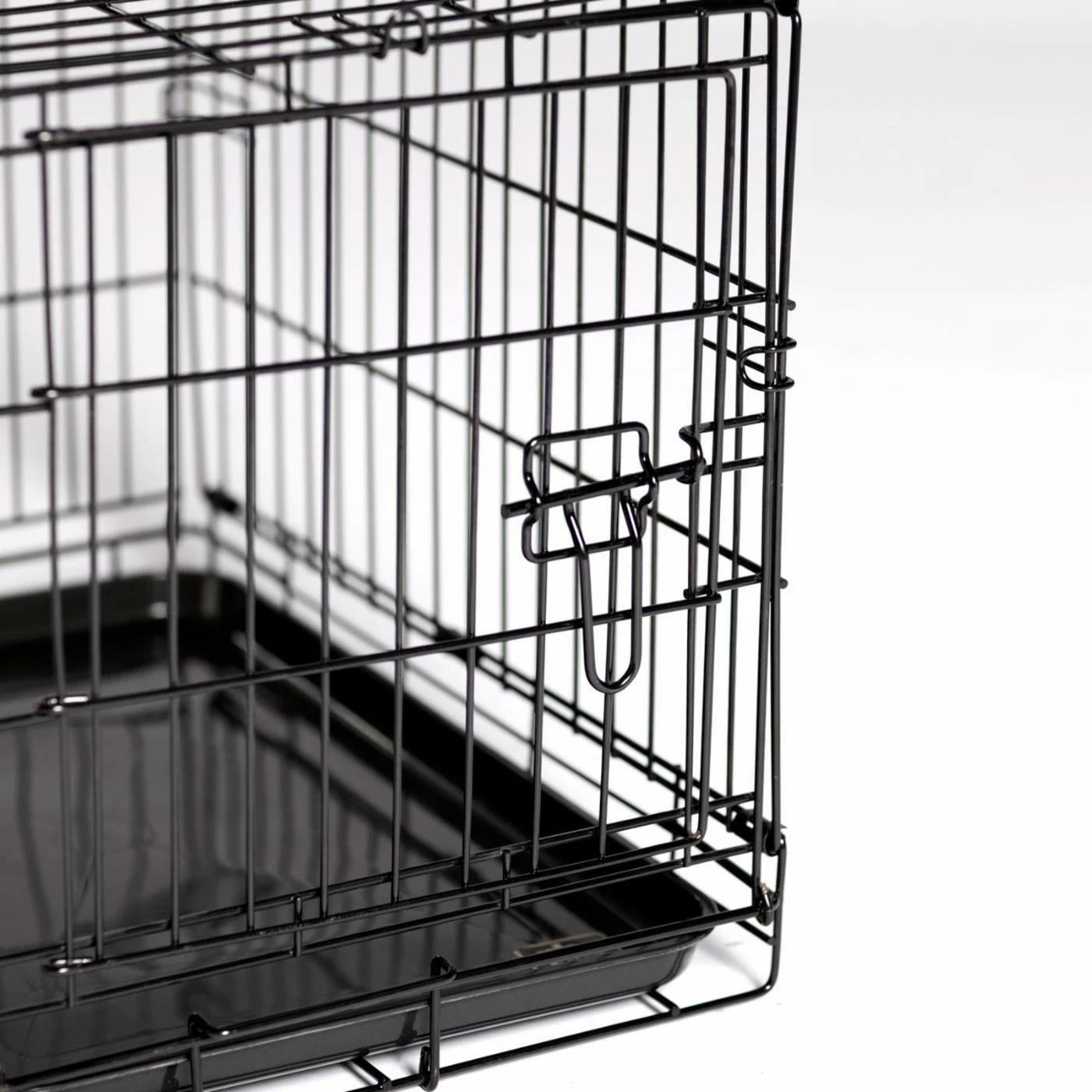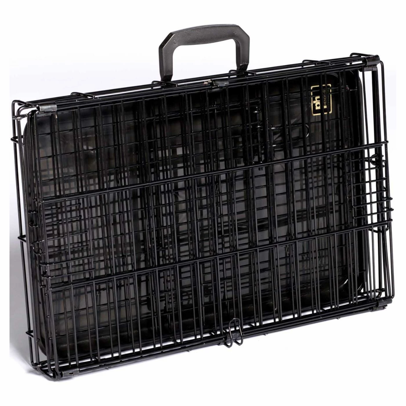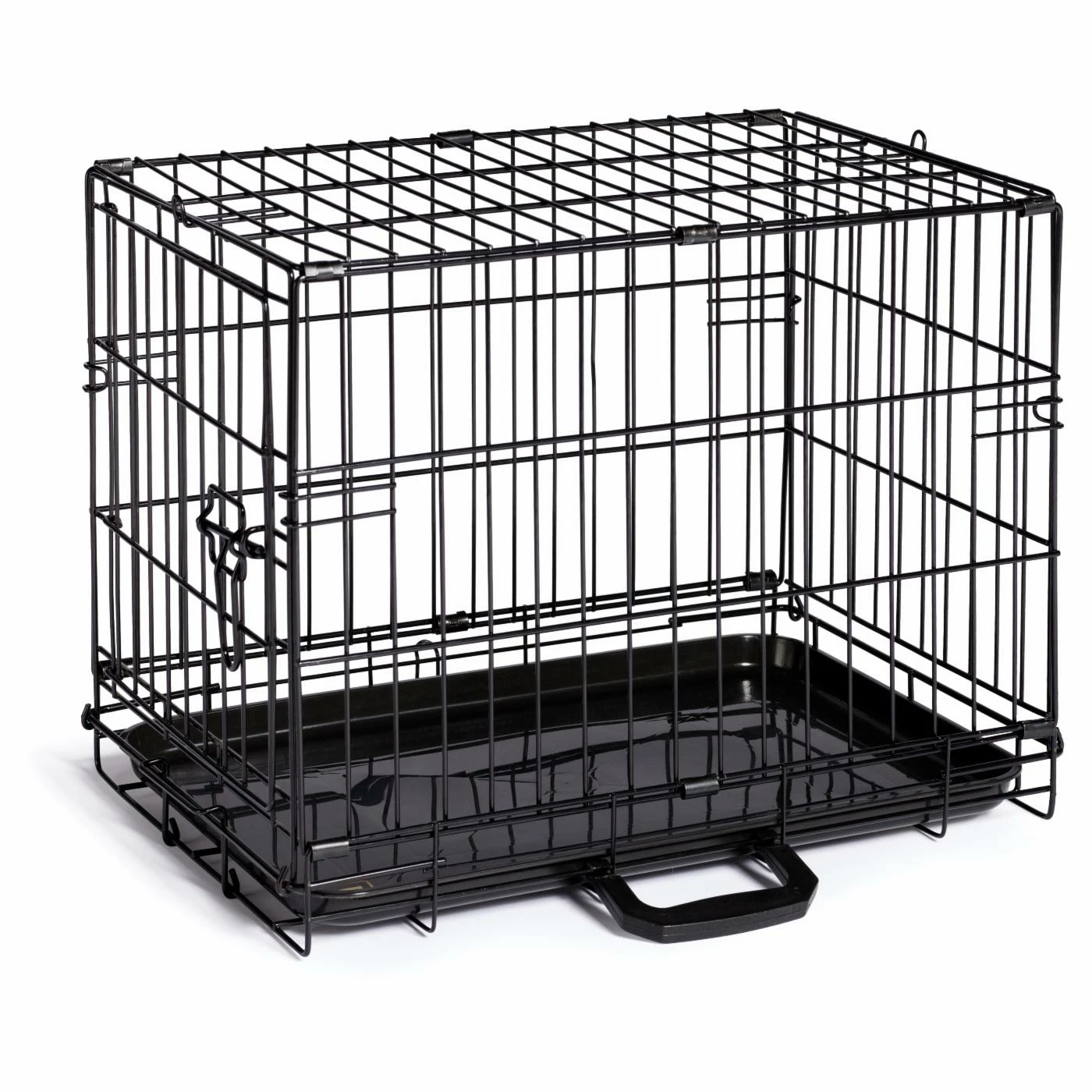 The Prevue Pet Products Home-On-The-Go Single Door Dog Crate is all about providing your pet with the highest level of safety and comfort. Designed to withstand years of use, this dog crate is constructed from heavy-gauge mesh for security and stability, while the powder-coated black finish is non-toxic, durable, and easy to clean. The large front door features a heavier framework plus security locks to prevent your pup from getting out. An extra-deep 1.5-inch plastic pan with rounded corners prevents leaks, contains mess, and can be removed separately for convenient cleaning. The lightweight single-door crate assembles easily without tools, features plastic handles for portability, and folds flat when not in use. Whether used for training or traveling, the Home-On-The-Go provides your pet with unobstructed views and better air ventilation than plastic kennels, and it won’t leak or stain like galvanized steel.