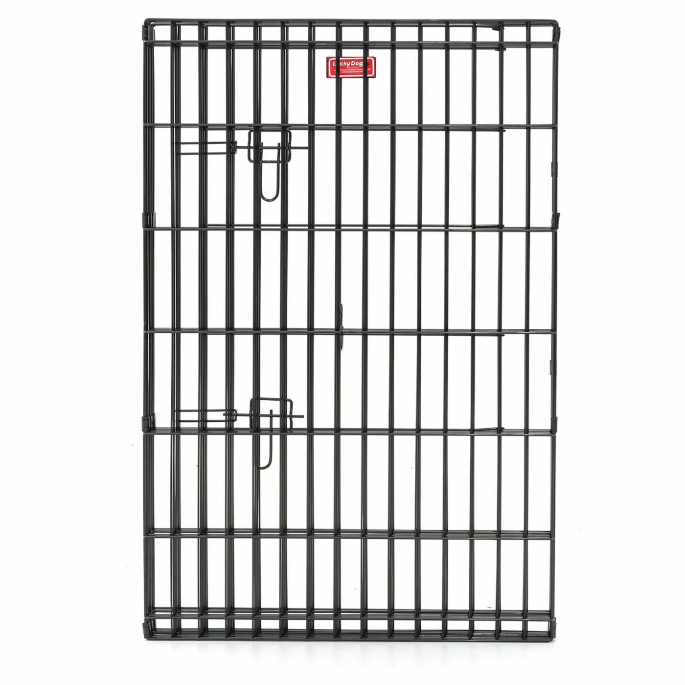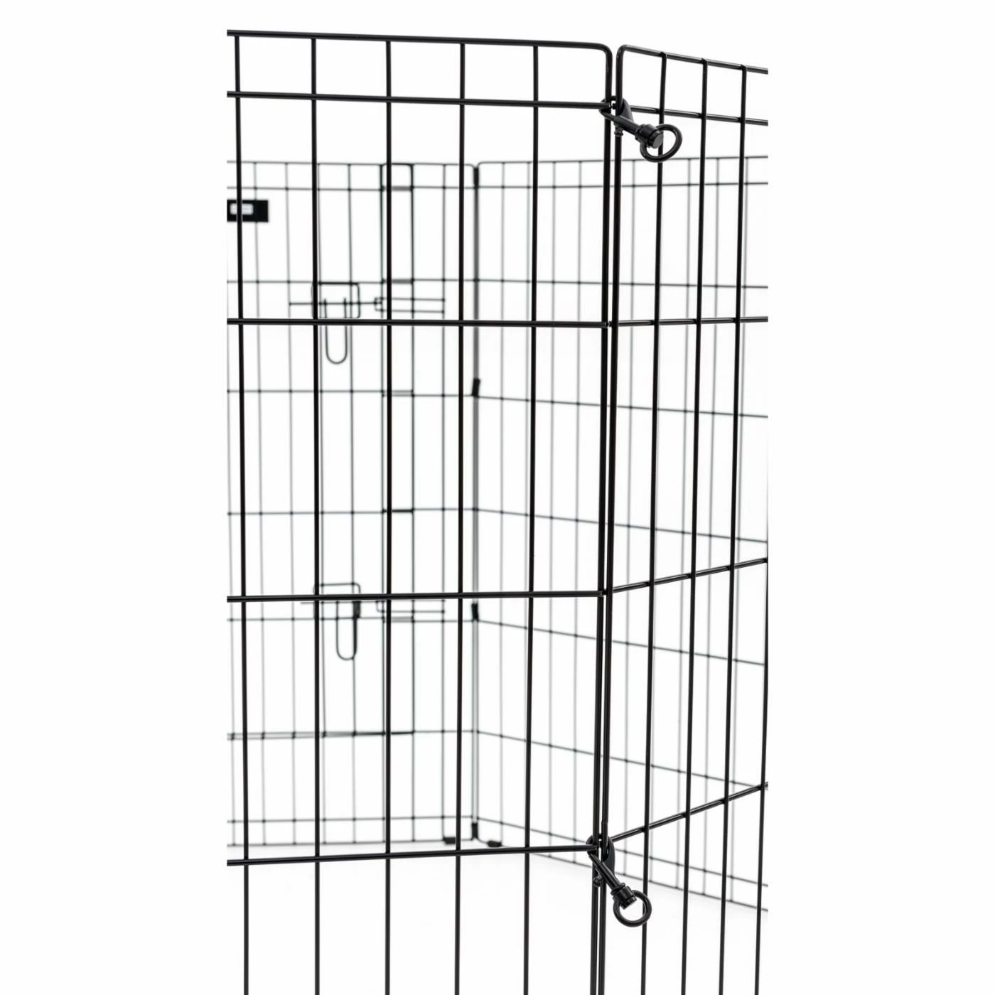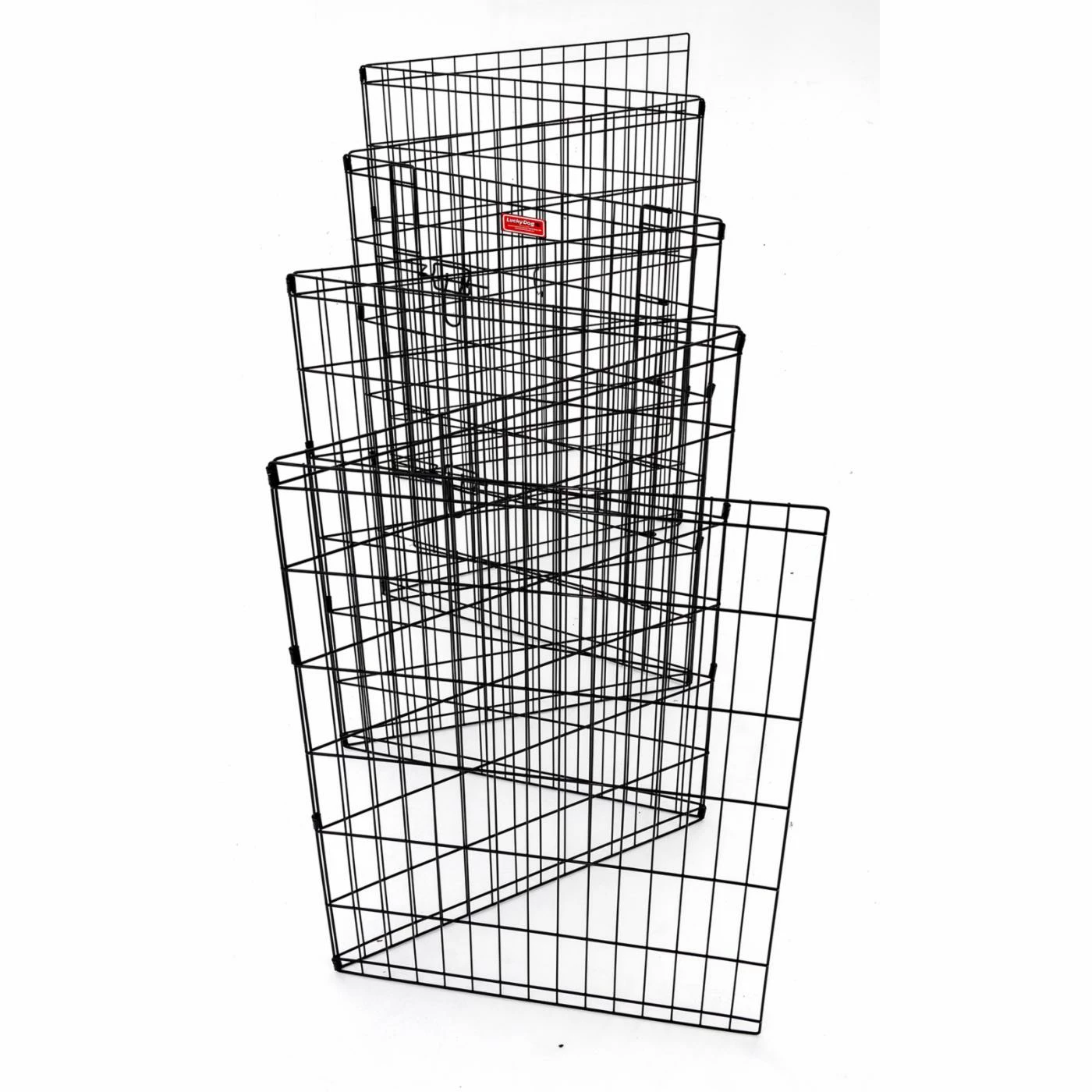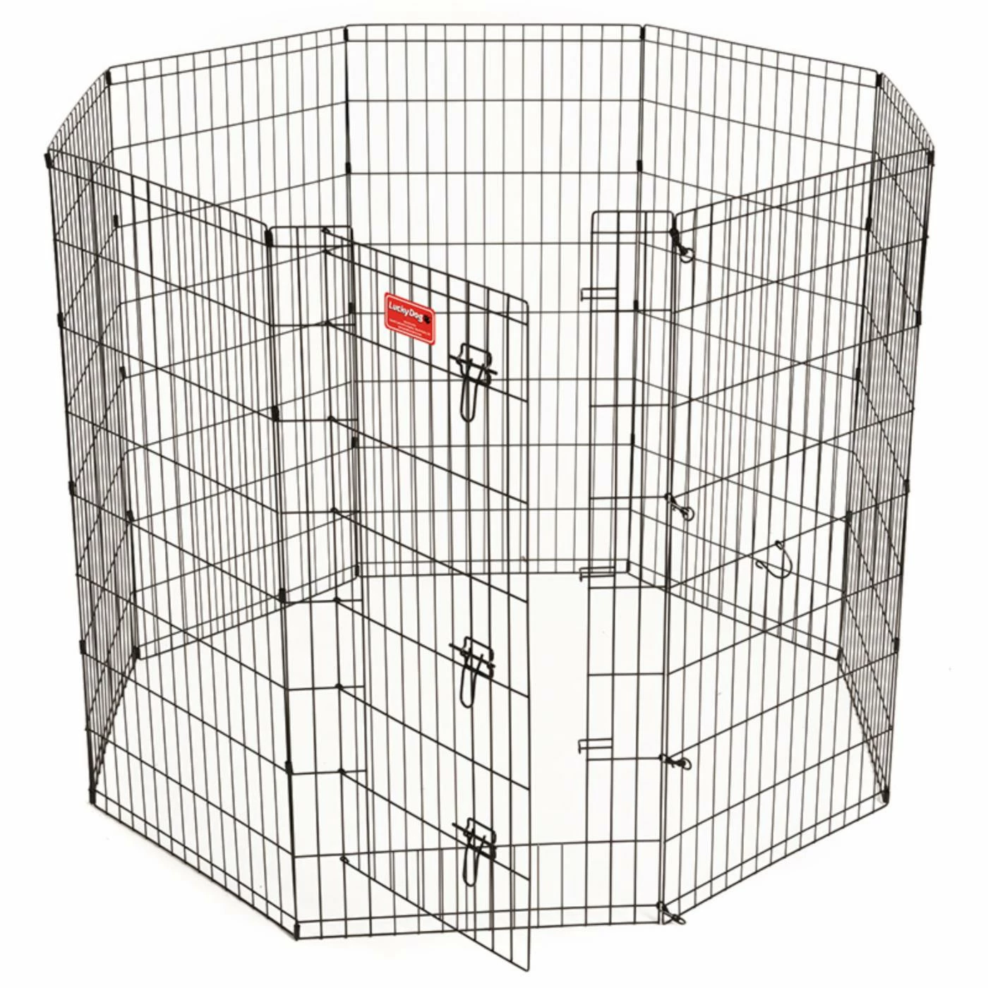 The Lucky Dog HD Wire Exercise Pen with Stakes, is an easy to set up indoor or outdoor, this 6 ft. circumference pen is a great way to keep your pet safe while still easily accessing your pet and allowing him/her to interact with family and friends. The double latch single front door helps with control and easy in and out access. Set up is 8 sided octagon shape. Each panel is 24 in. wide. Constructed of welded steel with rust-resistant E-coating finish. Durable for the most rambuctious pets. Available in 3 height options to accomodate all dog sizes. With ground stakes this exercise pen will work well with other animals such as rabbits, guinea pigs, and turtles. Let your pet enjoy the oudoors when you do. This pen requires no assembly it folds flat for storing and travel. Each size option is the same 36 in. diameter, you only need to choose the height you need.