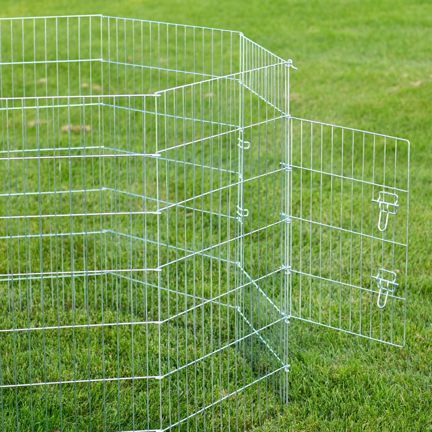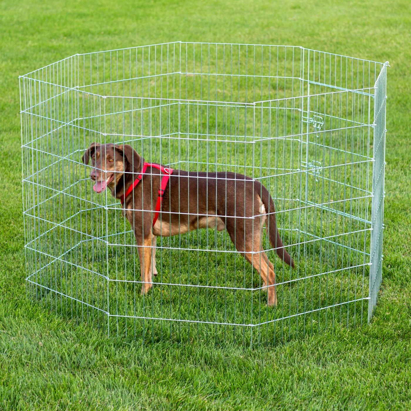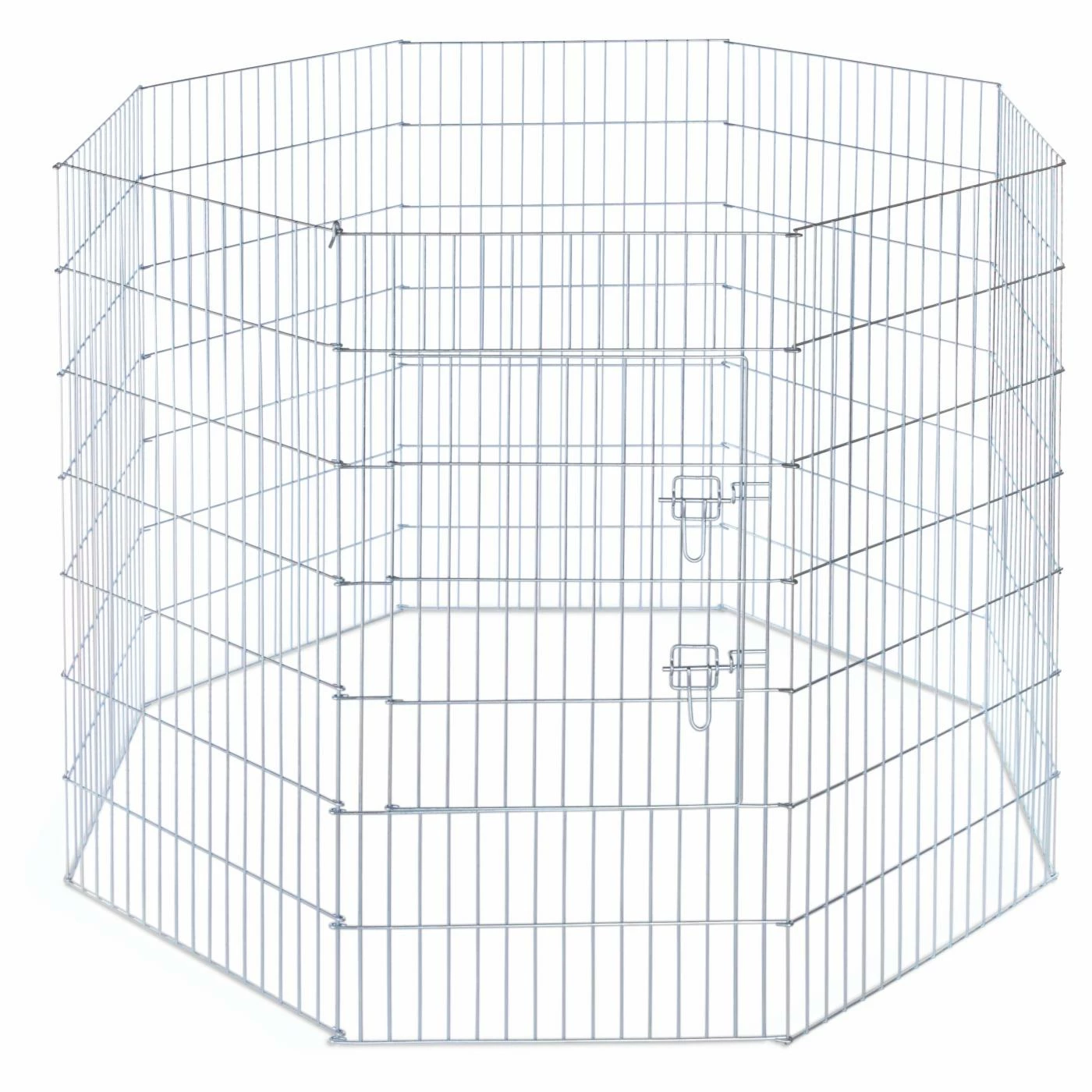The Prevue Pet Products Exercise Pen for Dogs will give your dog the space they need to run and play. Designed for small to medium sized dogs, this 8-panel exercise pen can be assembled quickly without the need for tools. The durable pen is made from solid steel rods and finished with bright zinc to prevent rust. Four grounding stakes hold the pen securely in place. A front door with 2 latches keeps your escape artist safely inside the pen. The pen folds flat for convenient travel and storage. On the go or at home, this exercise pen keeps your dog safe and secure while they get the fresh air they need.