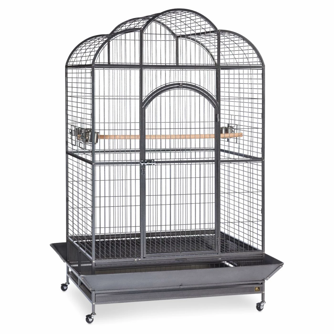 The Prevue Pet Products Silverado Macaw Cage is one of the largest cages available, thanks to its roomy dome-top design. The Silverado gives even the largest bird plenty of space to play and explore. Slip-in mesh panel construction combined with the pull-out bottom grille and drawer make cleaning easy, while rounded corner seed guards keep your floors clean too. Flathead hex bolts allow for easy cage assembly, and it cannot be unscrewed by birds. This extra-large birdcage also includes three stainless steel non-tip bowls and one hardwood perch. The wire spacing measures 1.375 inches. Dimensions: 46L x 36W x 78H inches.