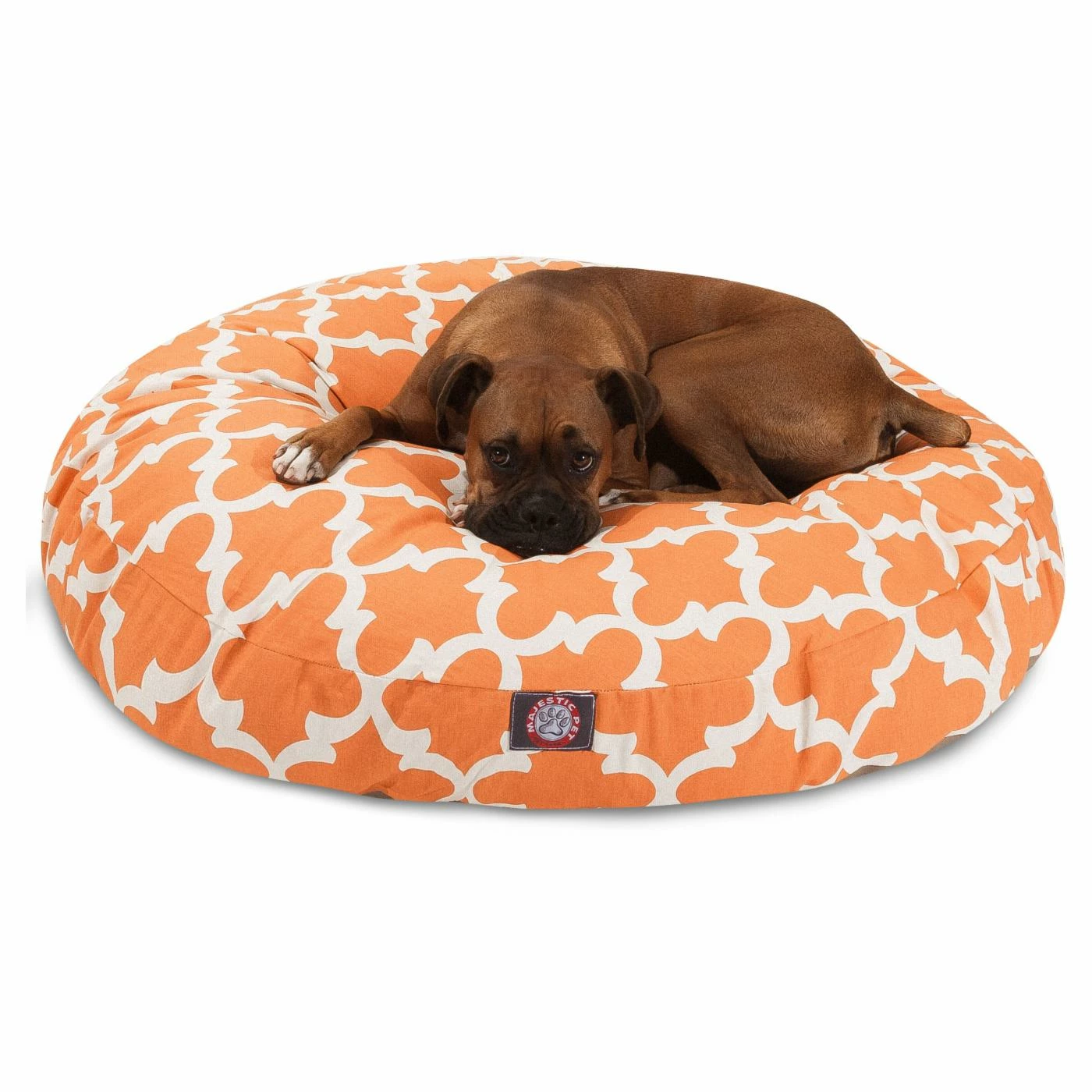 Water and stain resistant, the Majestic Pet Trellis Round Pillow Pet Bed upgrades your pets bed wonderfully. Designed for both comfort and style, this dog bed features a durable, outdoor treated cotton slipcover that is removable for your cleaning convenience. Filled with plush polyester fiber fill, your pup will be napping in lasting comfort. The base is covered in heavy-duty, waterproof Denier which allows you to move this bed inside or out with ease. This bed provides up to 1,000 hours of UV protection. Spot clean, air dry only.