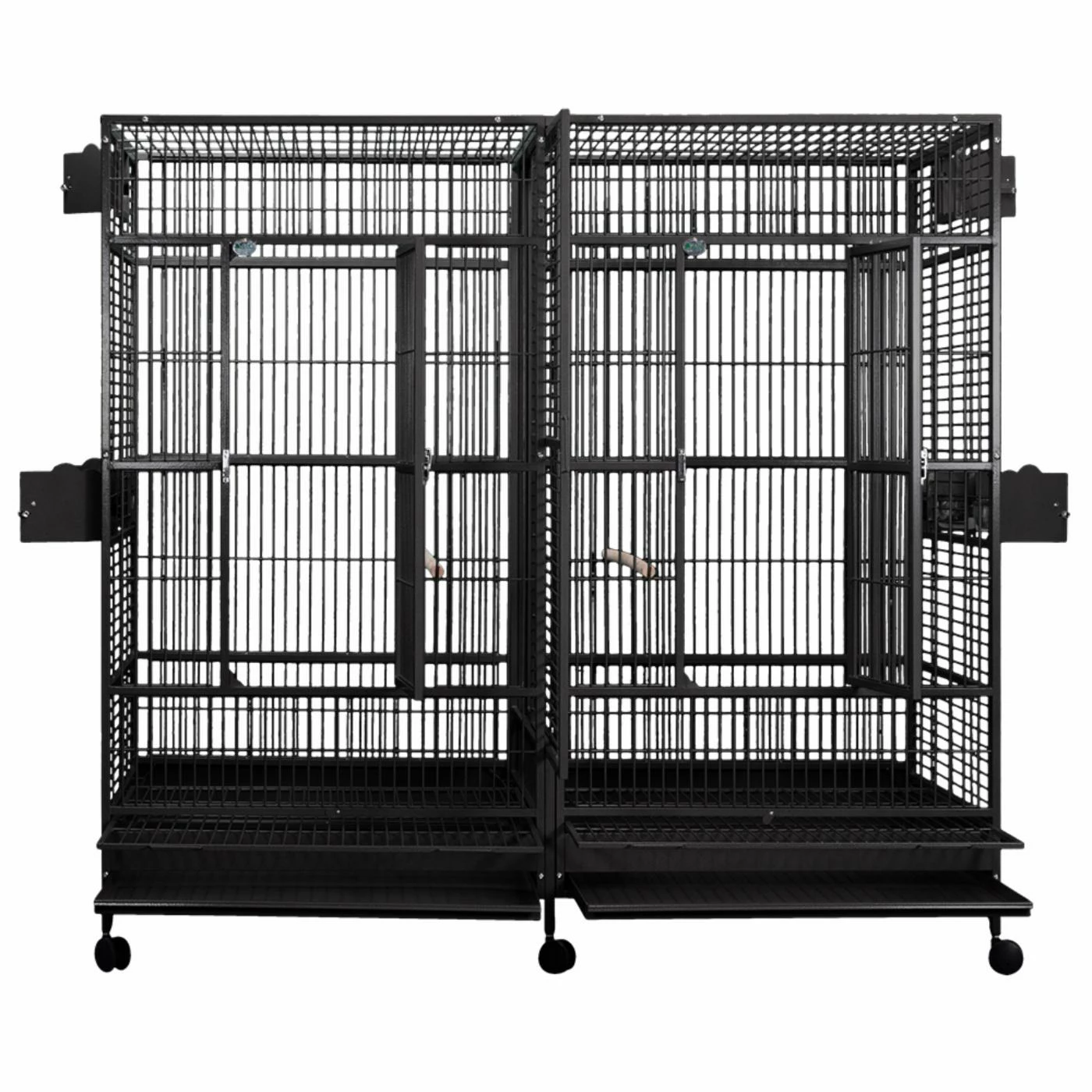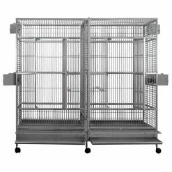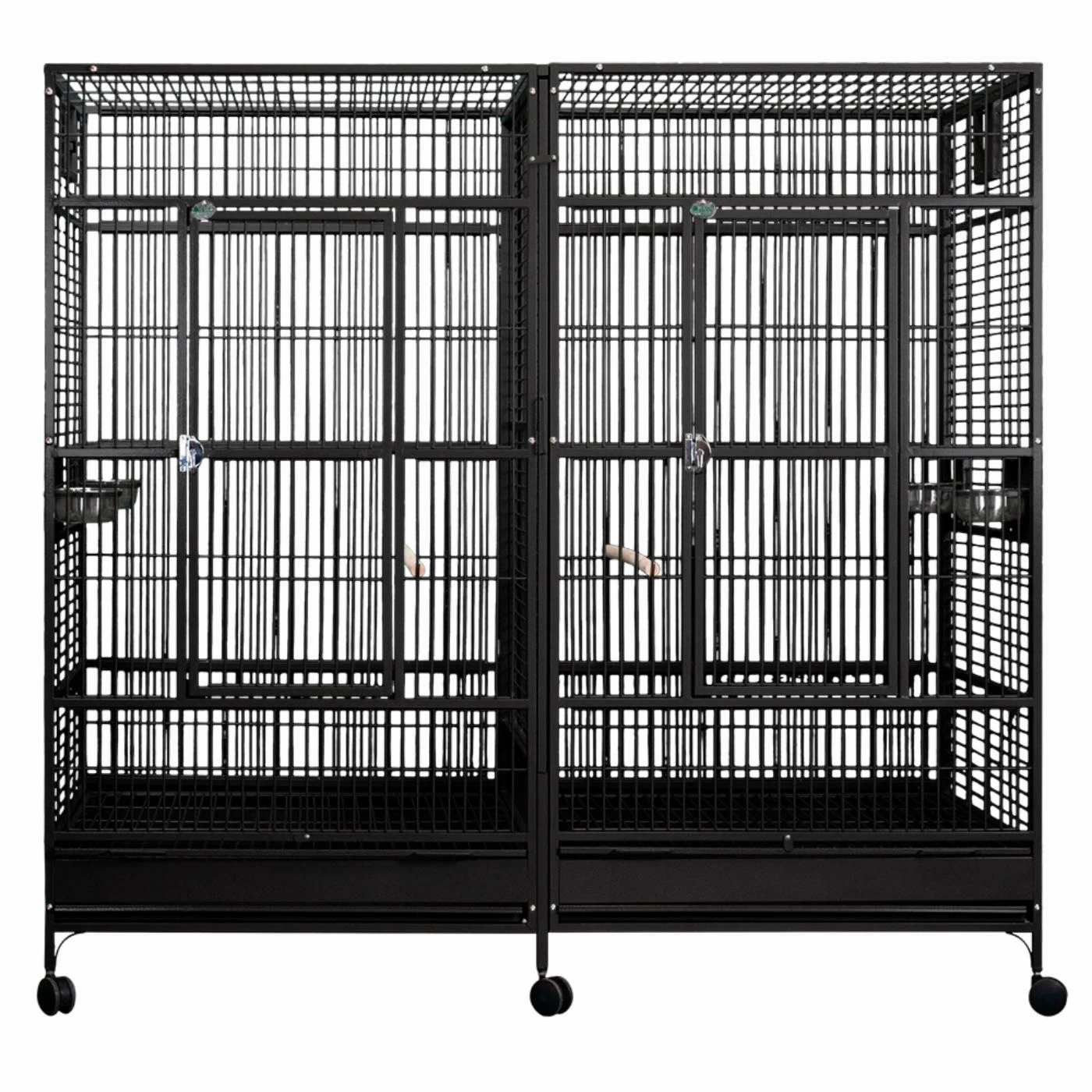The A and E Cage Co. Double Flat Top Macaw Cage is perfect for Macaws and larger parrots. This spacious cage features a bird-proof front door and feeder door that locks for added security. It also has an additional front door safety latch, four swing-out feeder doors, four stainless steel feeder cups, and dual perches. Two large front doors offer easy access for pet and owner while a removable divider turns one cage into two. It also comes with a slide-out grill and tray for easy clean up. This deluxe birdcage is crafted ofwrought iron with a powder coat finish available in a variety of color options.