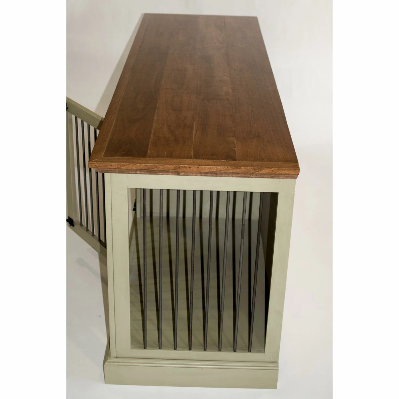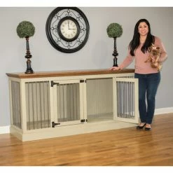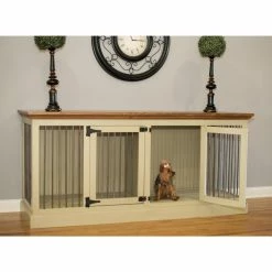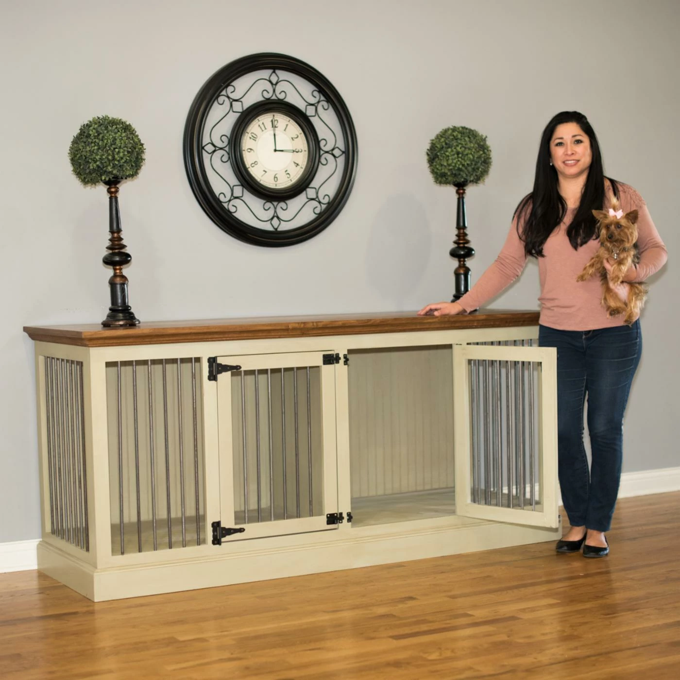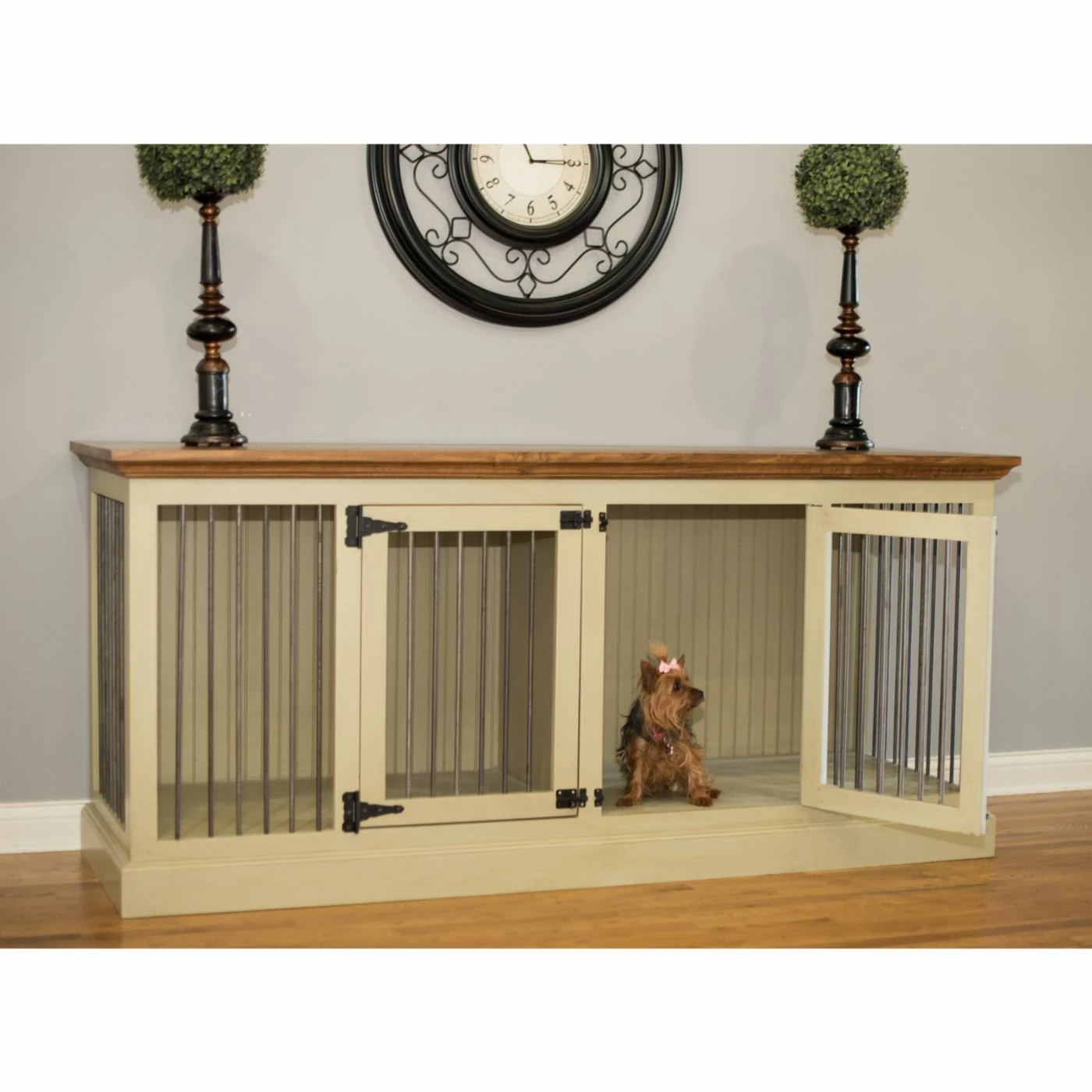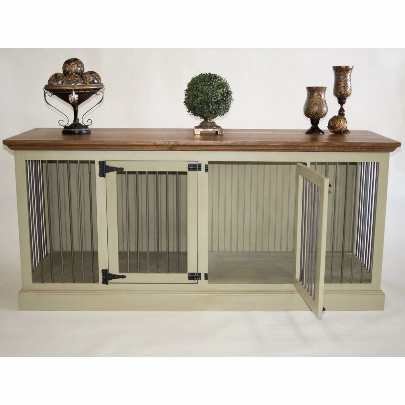 Your dog is a part of the family with the Eagle Furniture Medium Double Wide Dog Crate Credenza. This crate blends in alongside your other furniture with crown molding details and a surface that is ready for decorative accents. Made of solid birch, it is built to last. You can choose from available painted finishes to best match your dΓ©cor. Two doors, adorned with farm door style hardware, are latched with top and bottom barrel locks. The front and sides are surrounded by steel rods for visibility and rustic style.