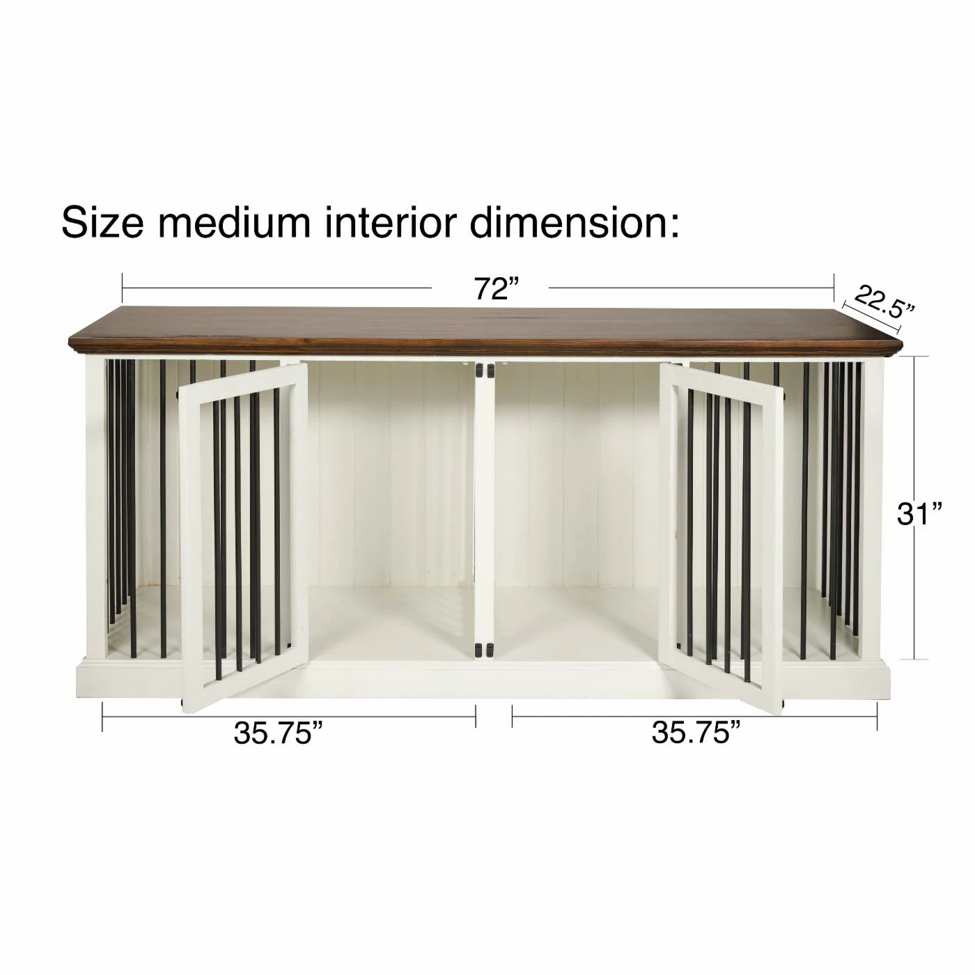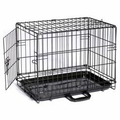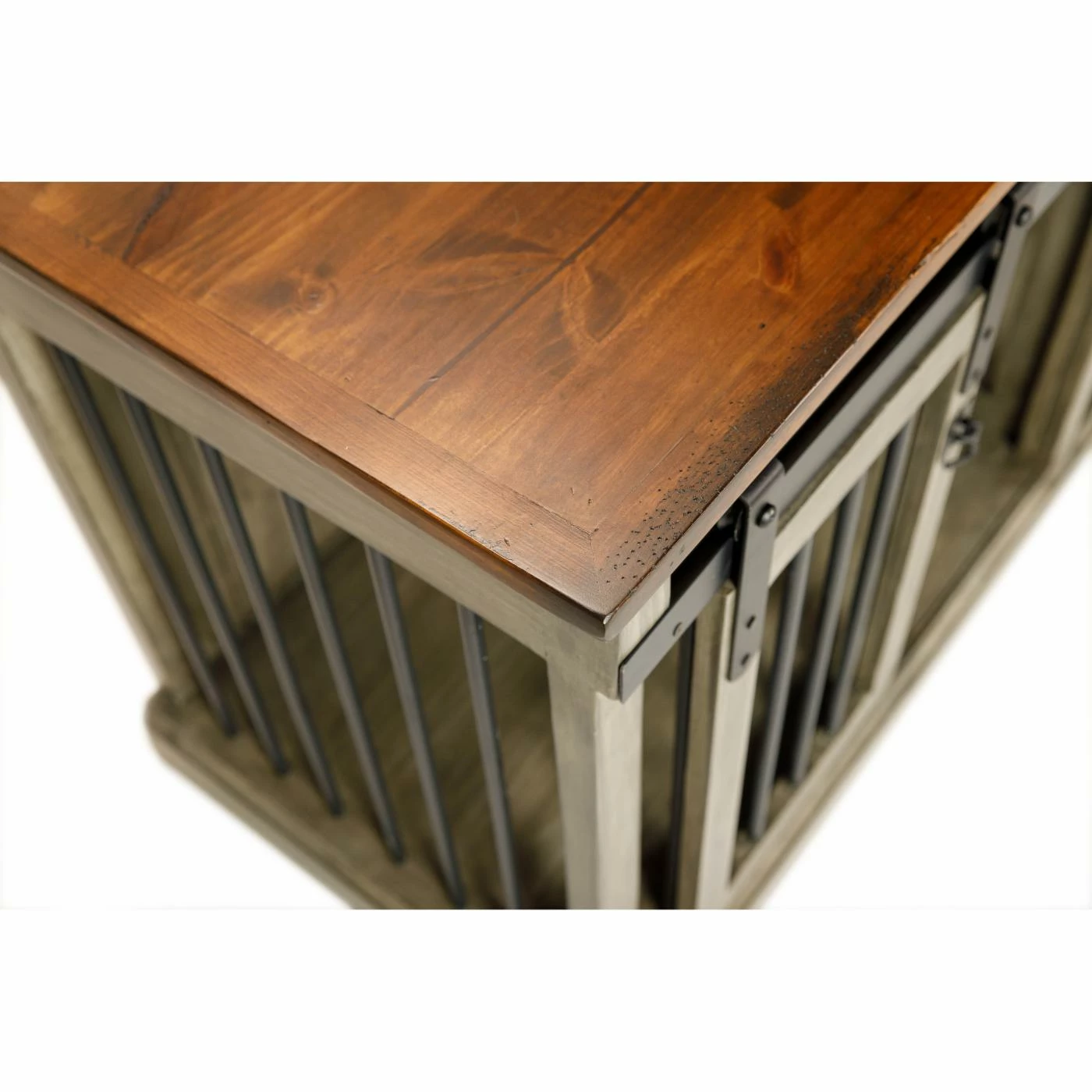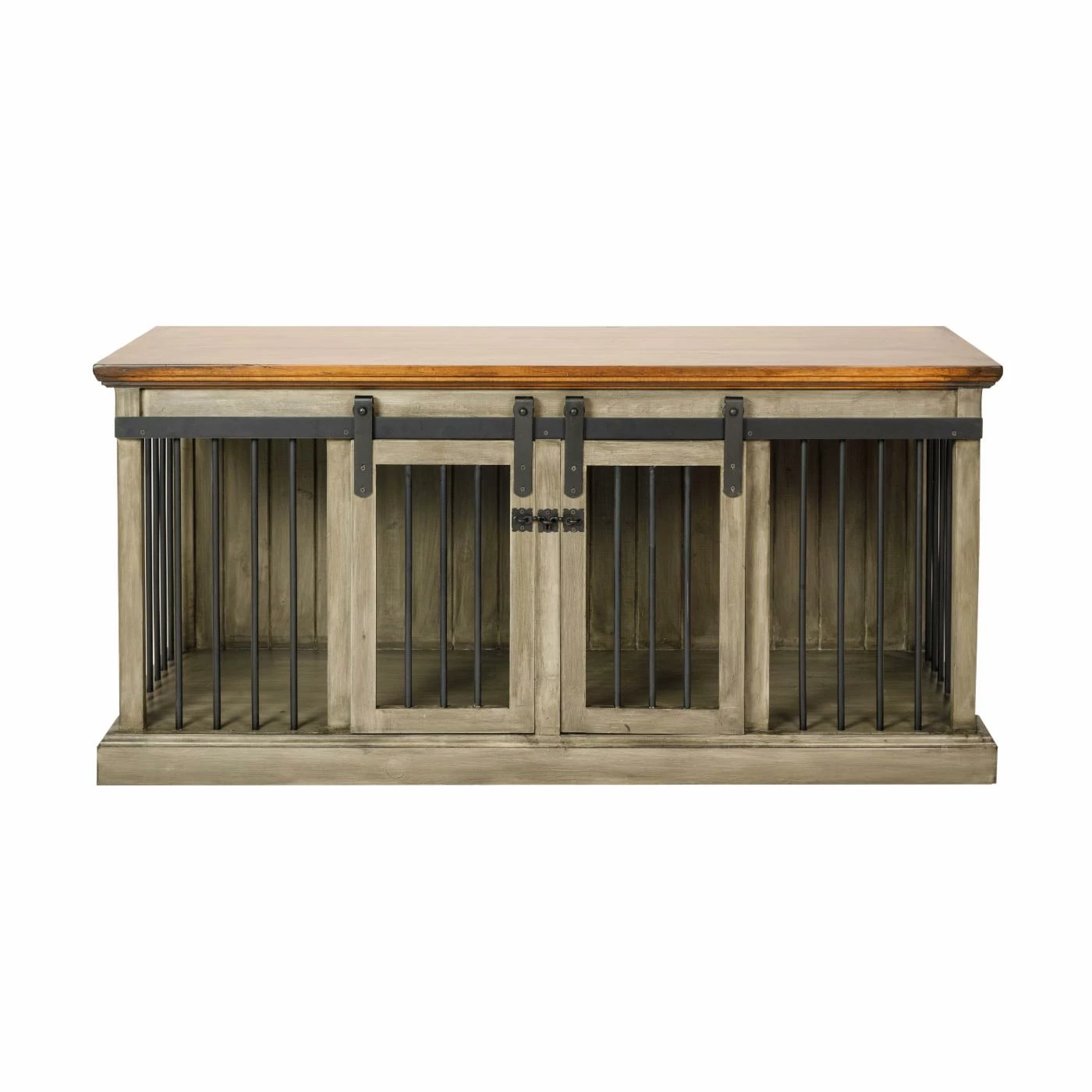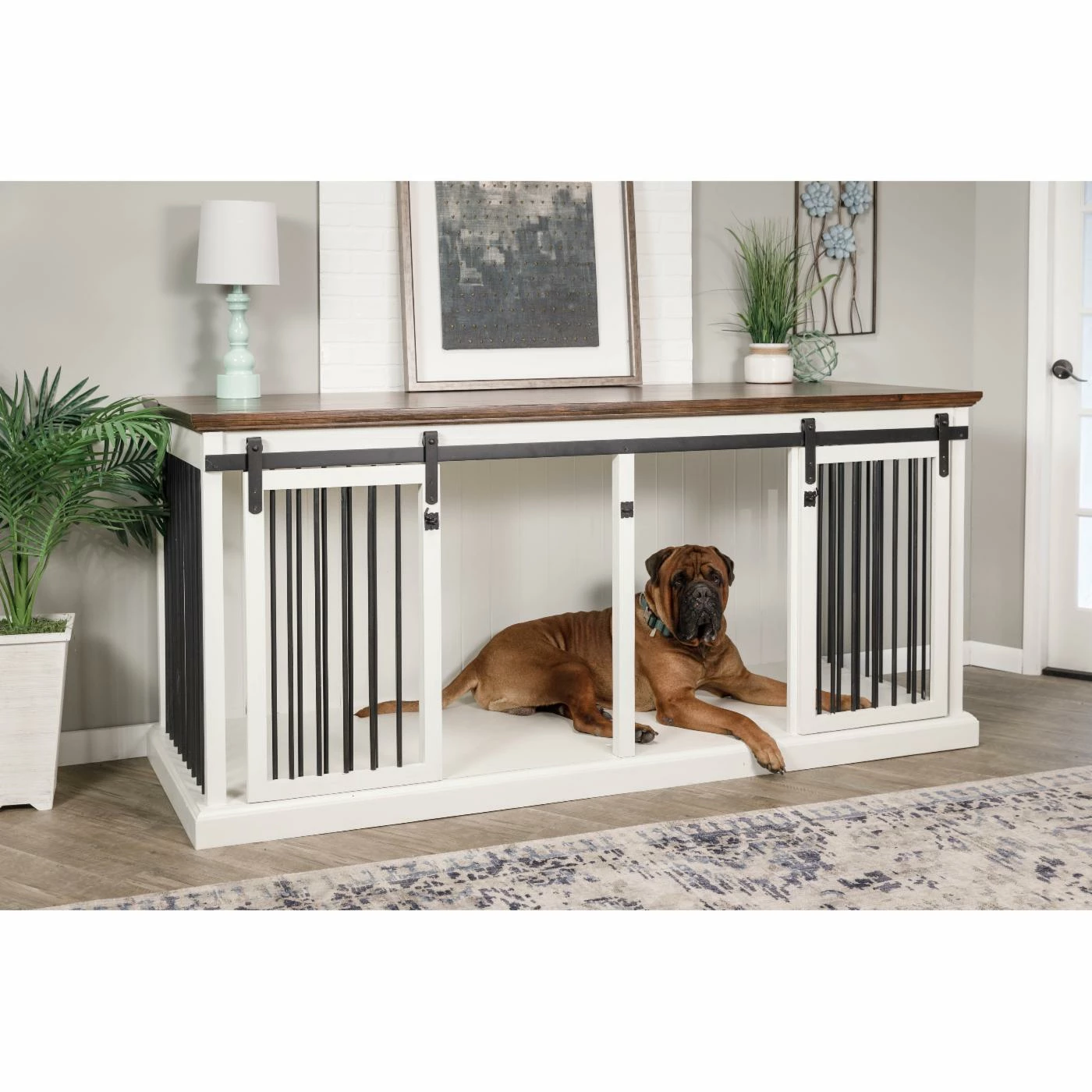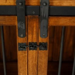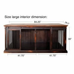 Give your pet a lounging place you both will love with the Safe Harbor Double Wide Sliding Barn Door Dog Crate With Removable Divider. Feel free to top this crate off with your decorative accents; it blends seamlessly with other pieces of furniture. A selection of finishes allows you to choose an option that will best match your dรฉcor. The front and sides are enclosed with aluminum rods for visibility and rustic style. Two sliding barn doors open to a spacious area that can be divided to accommodate two furry friends.