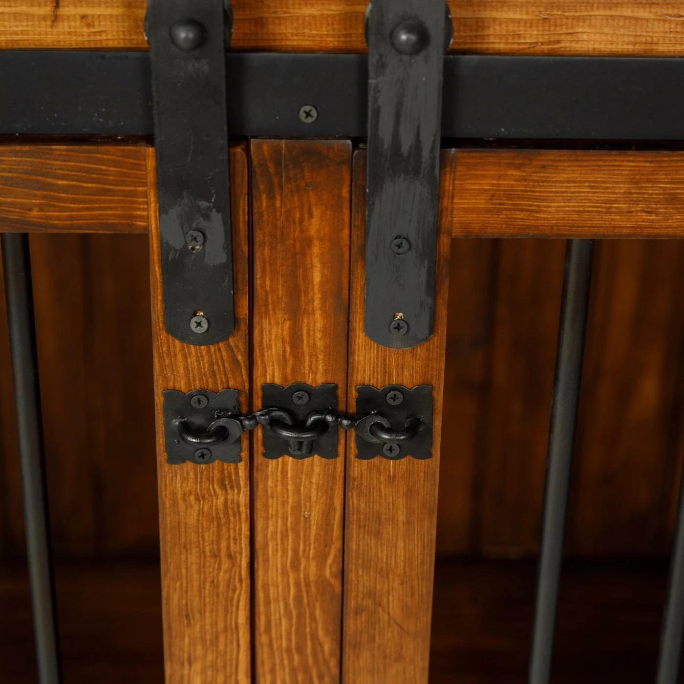 - Iron eye hook latches in the center of each door