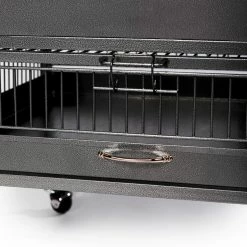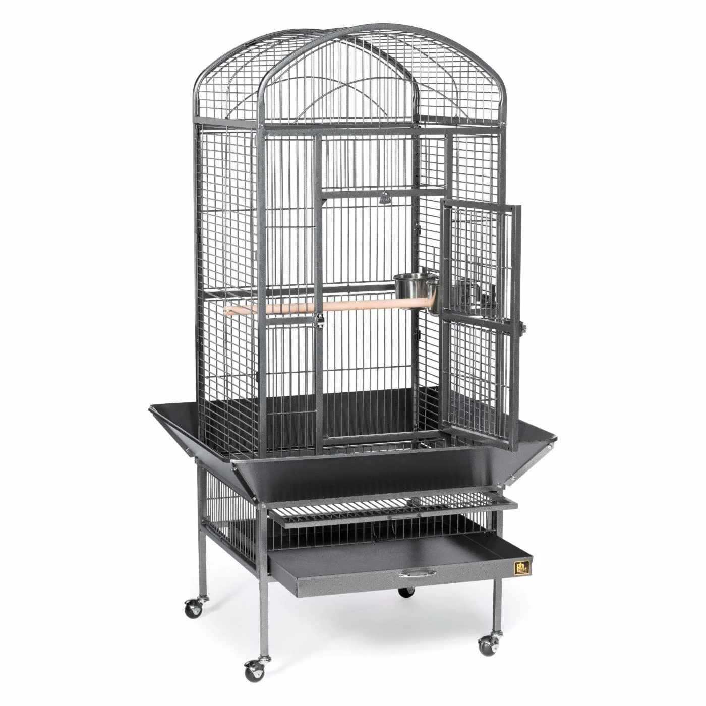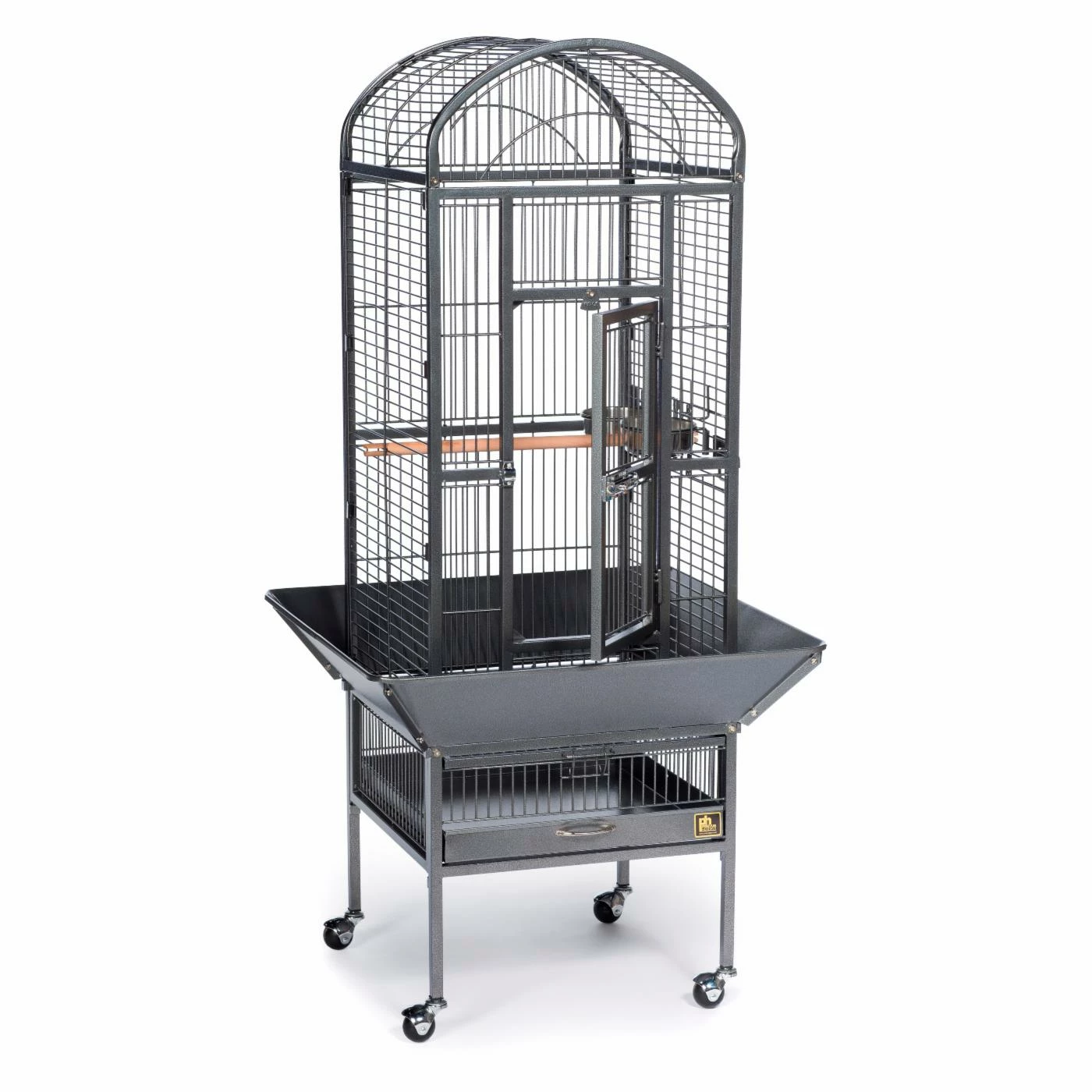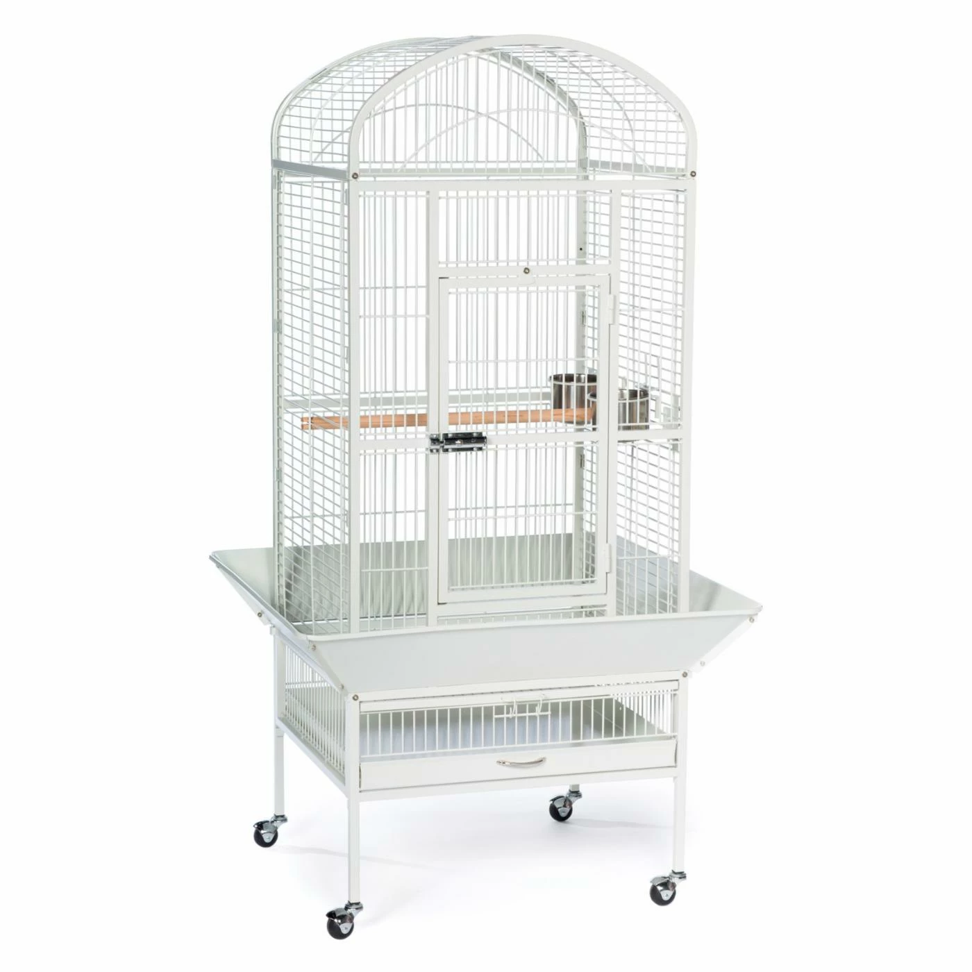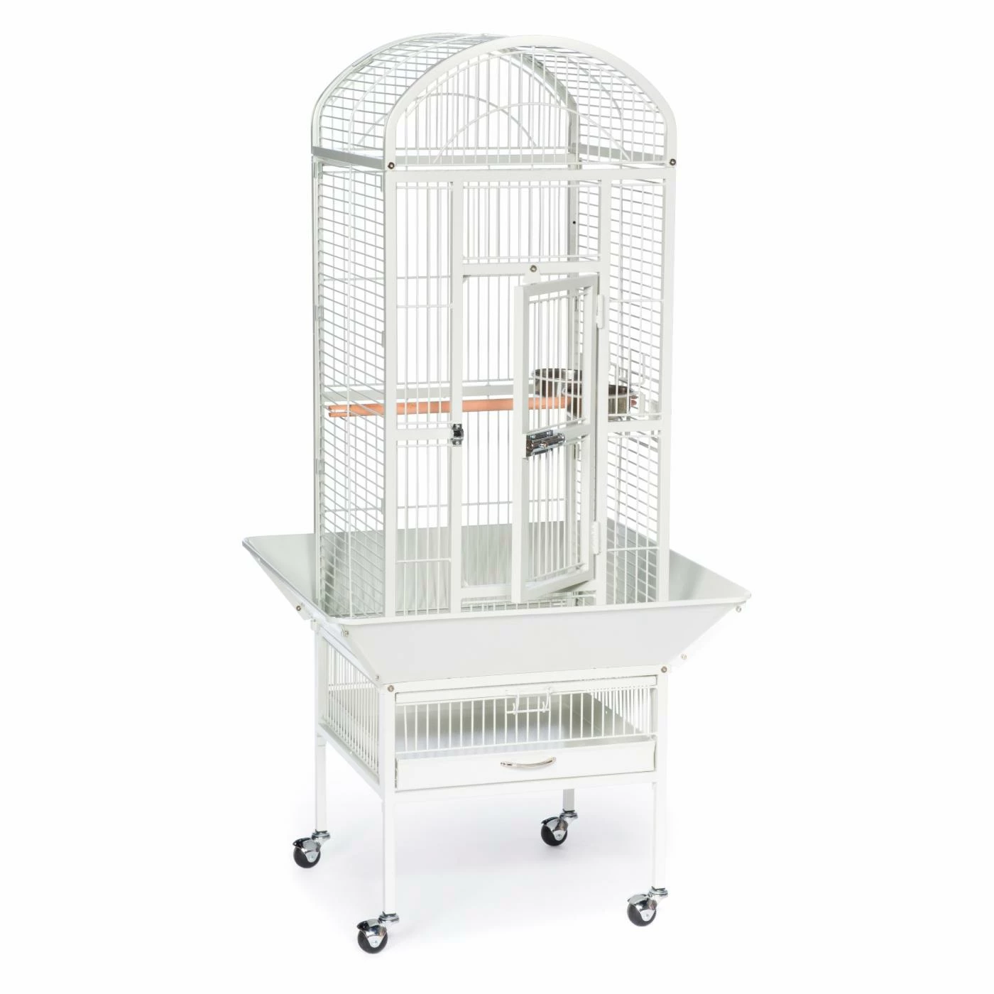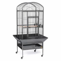 Give your bird all the space it needs to stretch and play securely in the Prevue Pet Products Dometop Bird Cage. This bird cage is constructed from wrought iron to provide a durable and pleasant home for your bird for years to come. This bird house is crafted with both birds and owners in mind. The door employs both a push button lock and a windbell lock to close securely and prevent escapes. The seed guard, designed to reduce mess from spillage, has rounded corners to eliminate snags on clothing or walls. A removable grille and debris tray makes cleaning this bird cage a snap. The stand is placed on casters that allow you to move the cage throughout your home. With a wooden perch and 2 stainless steel food and water cups, your bird will feel settled and content. Choose from available colors to find the perfect match for your home. This bird cage ships ready for easy assembly.