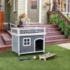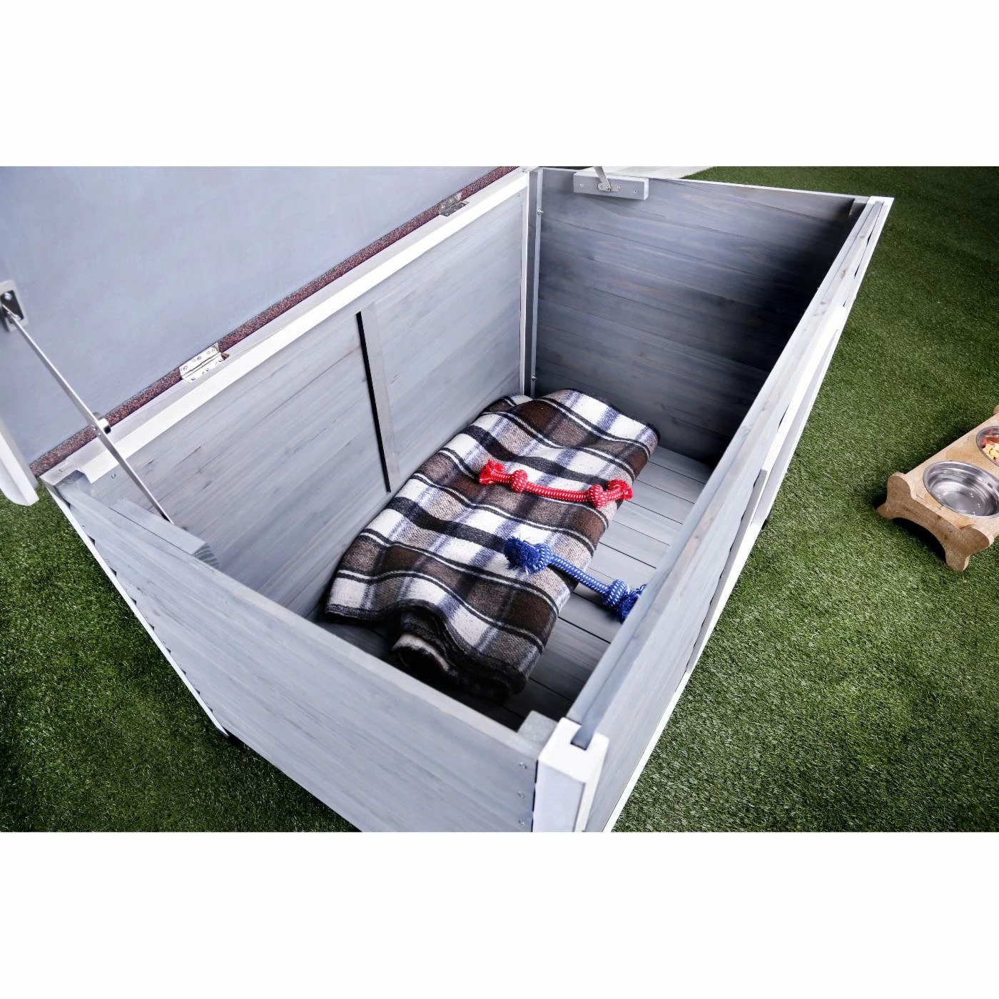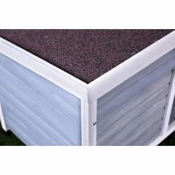 The Furniture of America Gayle Contemporary Dog House has a clean-lined contemporary style that’s chic in most any back yard. Crafted of durable wood, this dog house stands up to the elements with its weather-resistant design. The horizontal plank-style frame adds a rustic touch, and the gray finish is accented with white trim. Choose from available sizes.
