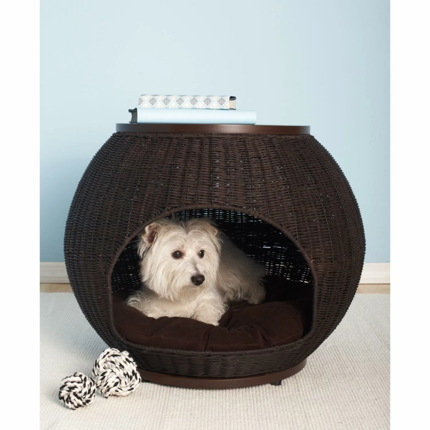 The Igloo Pet Bed Deluxe merges style and function for the ultimate in pet beds. Your dog or cat will love the soft cushion, and you’ll love the stylish faux rattan construction. With the refined wooden top, the bed doubles as a side table. The enclosed igloo-style makes animals feel safe and secure, so they’ll rest easily for hours. Choose from available finishes.